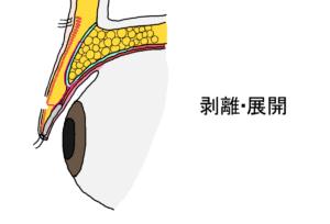 ②たるんでいる挙筋腱膜部分および縫い付ける先である瞼板部分を剥離します。