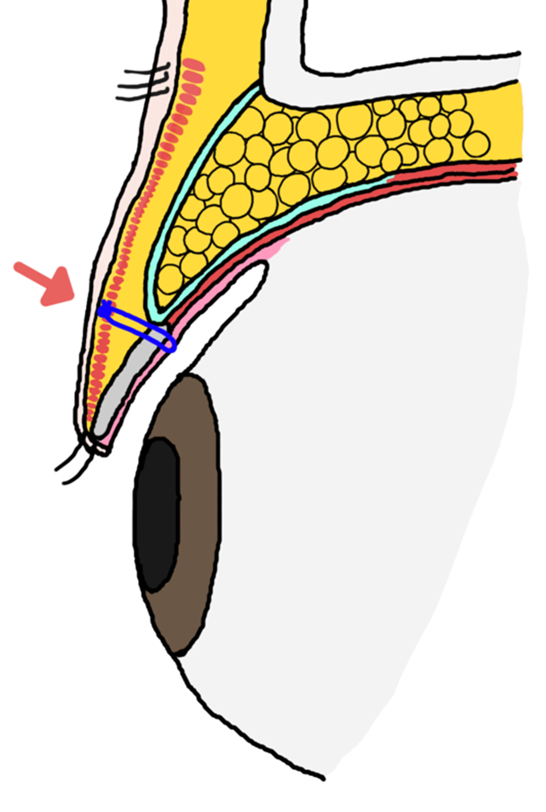 二重埋没法:二重のライン上に1ミリ程度の小穴をあけて手術用の糸を埋入し、二重の線を固定する施術です。