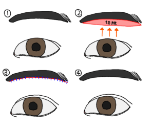眉の上の皮膚を切除して眉の位置を高く上げます。